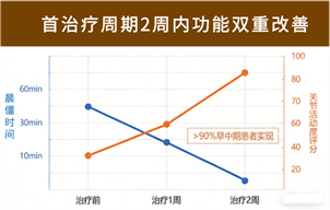 · 超过90%的早中期患者,在第一个治疗周期(通常为1-2周)内,晨僵时间明显缩短,颈椎、腰椎或髋关节的活动度获得实质性改善。